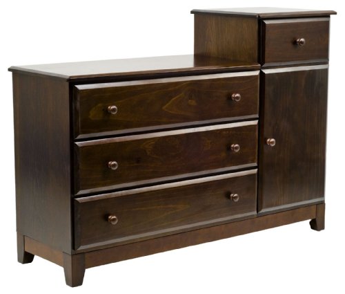 Davinci Emily II Combo Dresser- Espresso Everyone loves sweet serenity. That’s why everyone loves Emily. This combo dresser has drawer space, cabinet space, and display space. It’s the endearing engineering Emily does best. Like getting two pieces of furniture in one it combines two storage pieces, a dresser and shelved unit which will service the needs of a baby and young child but be just as appropriate for a teenager.This piece of nursery furniture features 3 long drawers which are perfect for storing clothing and another storage area with shelves behind a door--the perfect place to hide the clutter. Combo dresser has 3 drawers on one side and a fixed shelf on the other side. Drawers glide on metal hardware for easy access and has a stop mechanism that will lock that will not allow your little one to open it all the way. . Dresser top can fit most changer pads and can be used as changer as well. Lead and phthalate safe. Non-toxic finish. Made of solid New Zealand Pine wood from sustainable forests and engineered wood products. Hutch available, sold separately We recommend the M5316, 34 contour pad, or M5319, 31 contour pad to use on this dresser. Dimensions: 54" W x 17" L x 39" H Weight 104 lbs